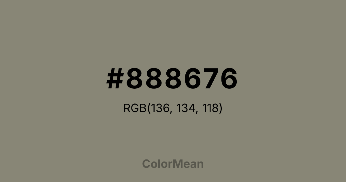 #888676 RGB value is (136, 134, 118). The hex color red value is 136, green is 134, and blue is 118. Its HSL format shows a hue of 53°, saturation of 7 percent, and lightness of 50 percent. The CMYK process values are 0 percent, 1 percent, 13 percent, 47 percent.