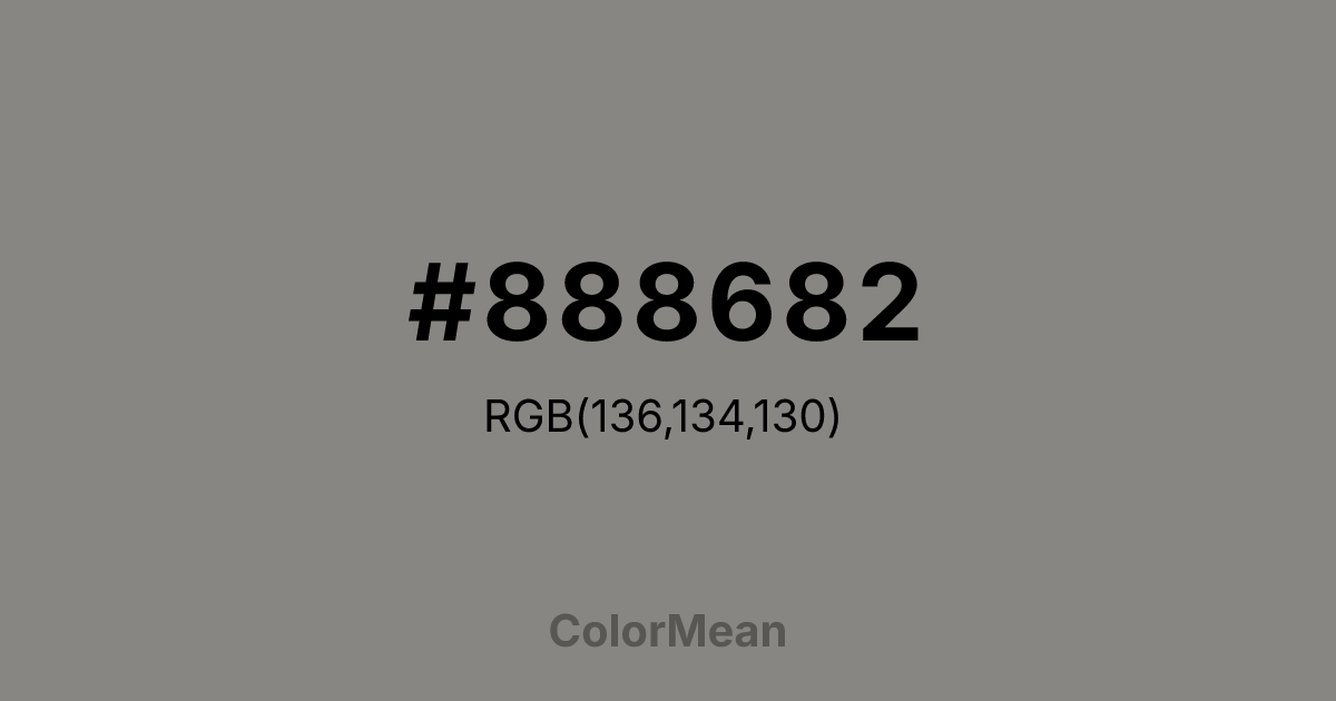 #888682 RGB value is (136, 134, 130). The hex color red value is 136, green is 134, and blue is 130. Its HSL format shows a hue of 40°, saturation of 2 percent, and lightness of 52 percent. The CMYK process values are 0 percent, 1 percent, 4 percent, 47 percent.
