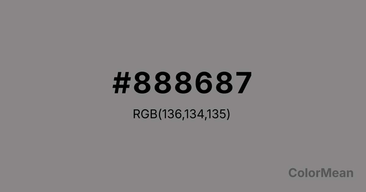 #888687 RGB value is (136, 134, 135). The hex color red value is 136, green is 134, and blue is 135. Its HSL format shows a hue of 330°, saturation of 1 percent, and lightness of 53 percent. The CMYK process values are 0 percent, 1 percent, 1 percent, 47 percent.