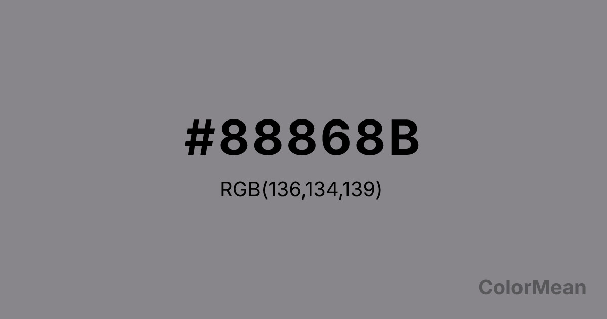 #88868B RGB value is (136, 134, 139). The hex color red value is 136, green is 134, and blue is 139. Its HSL format shows a hue of 264°, saturation of 2 percent, and lightness of 54 percent. The CMYK process values are 2 percent, 4 percent, 0 percent, 45 percent.