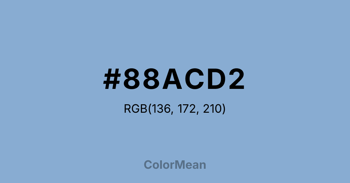 #88ACD2 RGB value is (136, 172, 210). The hex color red value is 136, green is 172, and blue is 210. Its HSL format shows a hue of 211°, saturation of 45 percent, and lightness of 68 percent. The CMYK process values are 35 percent, 18 percent, 0 percent, 18 percent.