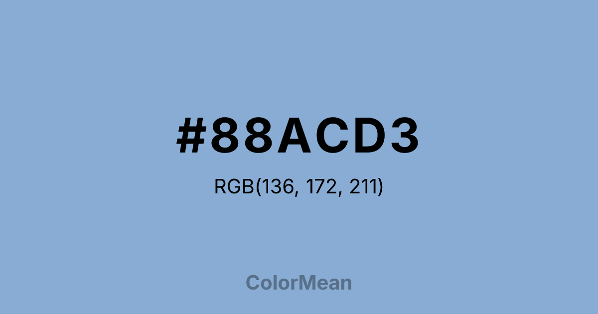 #88ACD3 RGB value is (136, 172, 211). The hex color red value is 136, green is 172, and blue is 211. Its HSL format shows a hue of 211°, saturation of 46 percent, and lightness of 68 percent. The CMYK process values are 36 percent, 18 percent, 0 percent, 17 percent.