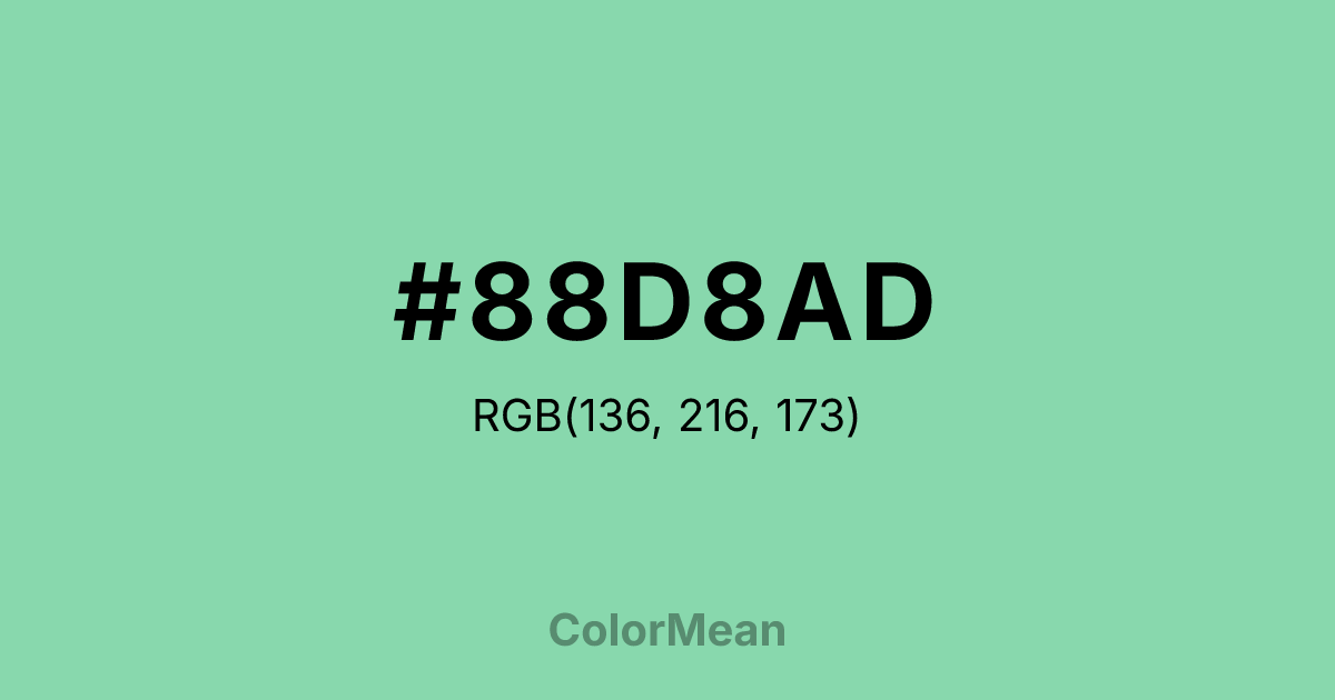 #88D8AD RGB value is (136, 216, 173). The hex color red value is 136, green is 216, and blue is 173. Its HSL format shows a hue of 148°, saturation of 51 percent, and lightness of 69 percent. The CMYK process values are 37 percent, 0 percent, 20 percent, 15 percent.