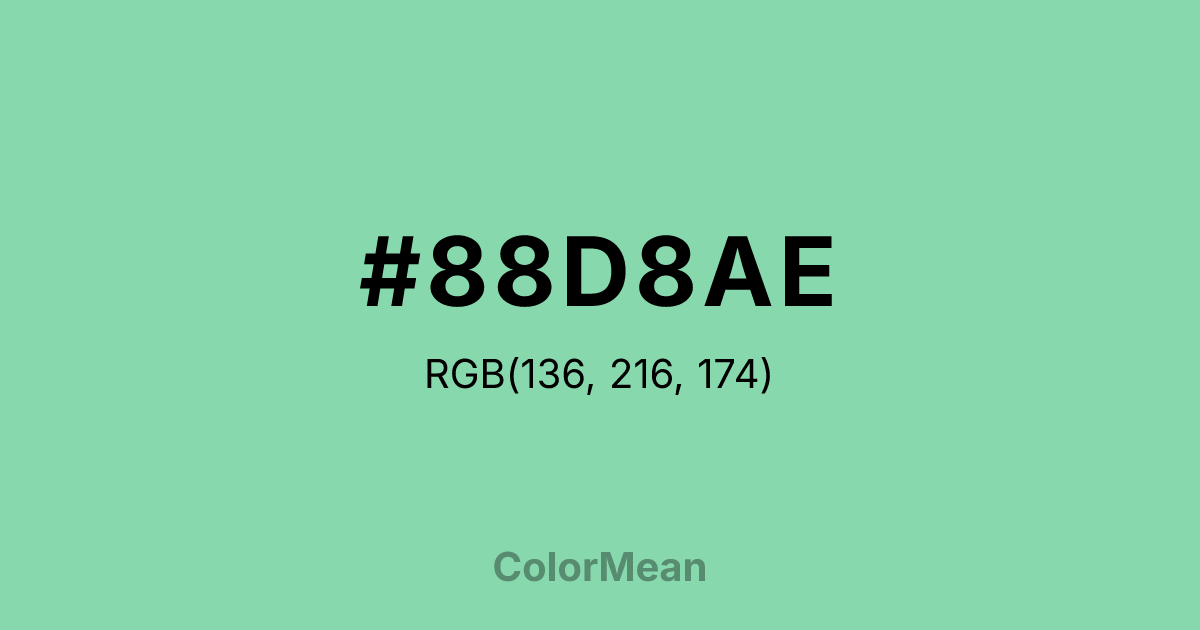 #88D8AE RGB value is (136, 216, 174). The hex color red value is 136, green is 216, and blue is 174. Its HSL format shows a hue of 149°, saturation of 51 percent, and lightness of 69 percent. The CMYK process values are 37 percent, 0 percent, 19 percent, 15 percent.