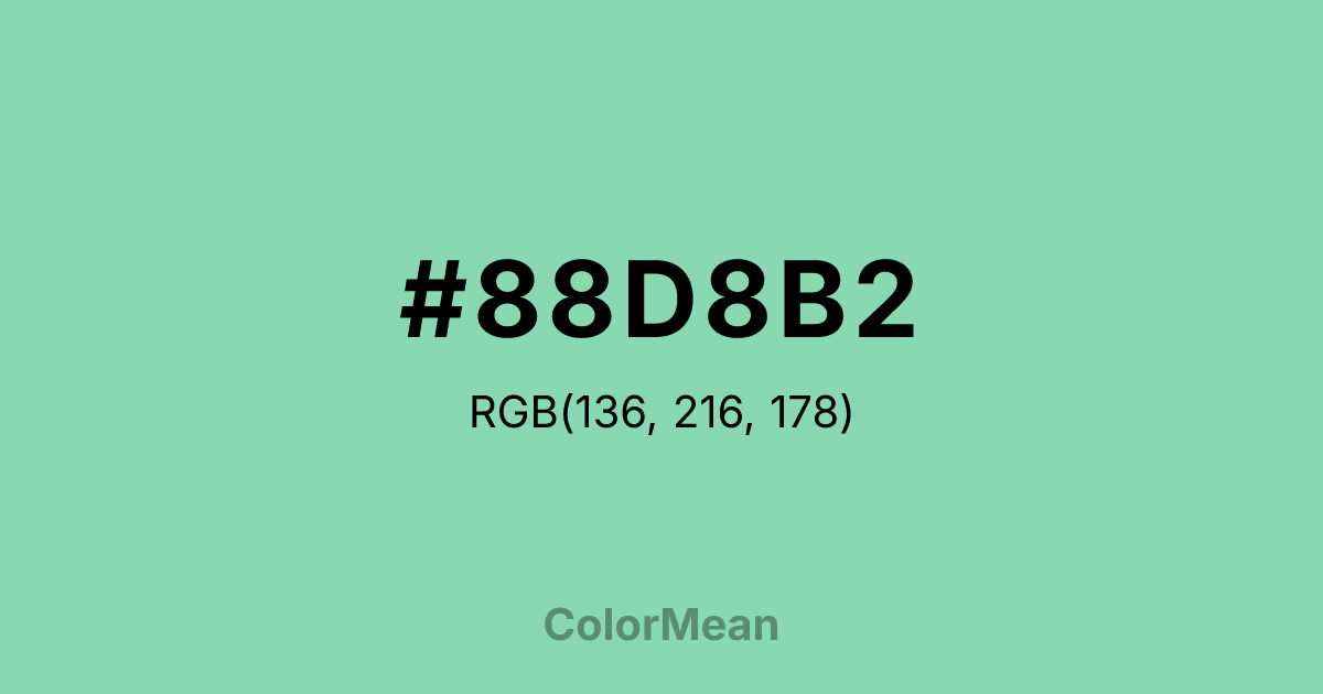 #88D8B2 RGB value is (136, 216, 178). The hex color red value is 136, green is 216, and blue is 178. Its HSL format shows a hue of 152°, saturation of 51 percent, and lightness of 69 percent. The CMYK process values are 37 percent, 0 percent, 18 percent, 15 percent.