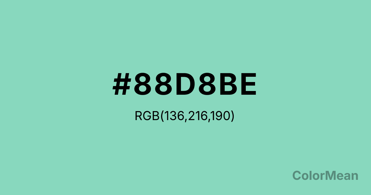 #88D8BE RGB value is (136, 216, 190). The hex color red value is 136, green is 216, and blue is 190. Its HSL format shows a hue of 161°, saturation of 51 percent, and lightness of 69 percent. The CMYK process values are 37 percent, 0 percent, 12 percent, 15 percent.