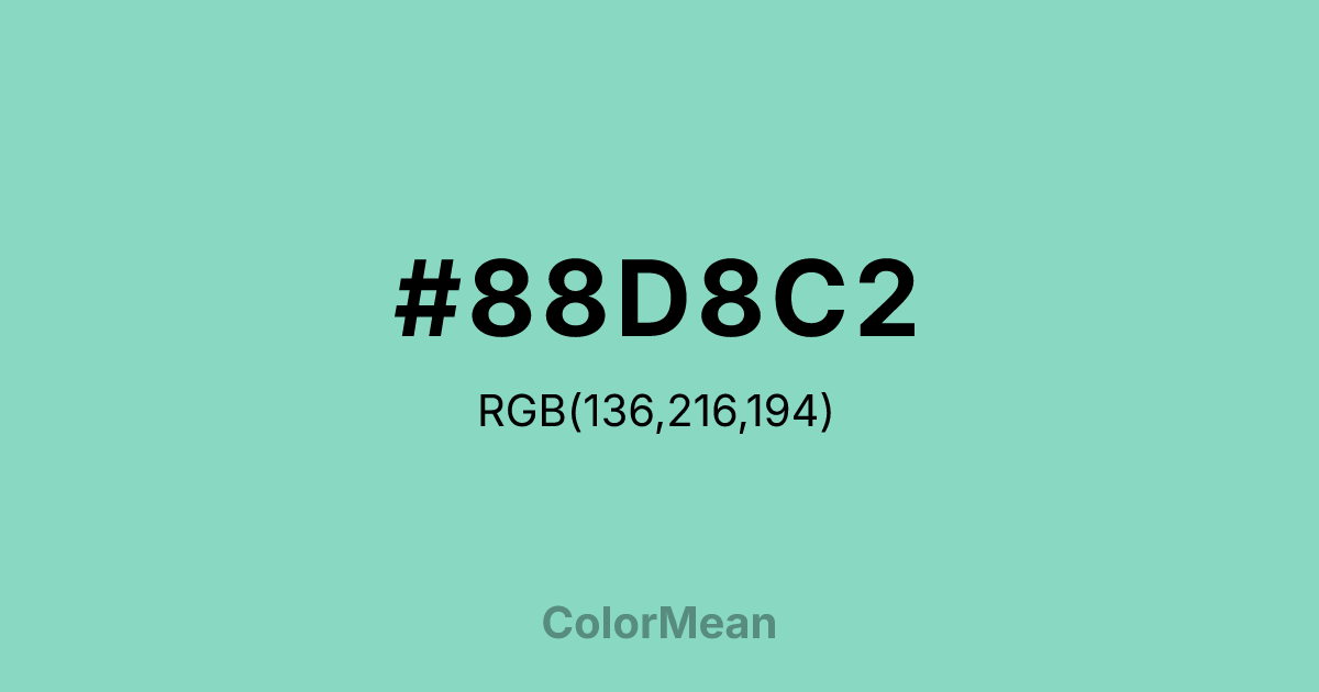 #88D8C2 RGB value is (136, 216, 194). The hex color red value is 136, green is 216, and blue is 194. Its HSL format shows a hue of 163°, saturation of 51 percent, and lightness of 69 percent. The CMYK process values are 37 percent, 0 percent, 10 percent, 15 percent.