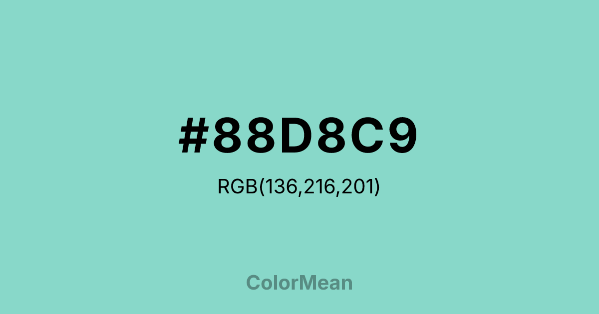 #88D8C9 RGB value is (136, 216, 201). The hex color red value is 136, green is 216, and blue is 201. Its HSL format shows a hue of 169°, saturation of 51 percent, and lightness of 69 percent. The CMYK process values are 37 percent, 0 percent, 7 percent, 15 percent.