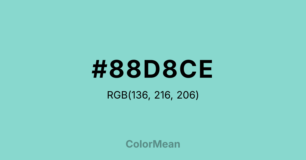 #88D8CE RGB value is (136, 216, 206). The hex color red value is 136, green is 216, and blue is 206. Its HSL format shows a hue of 173°, saturation of 51 percent, and lightness of 69 percent. The CMYK process values are 37 percent, 0 percent, 5 percent, 15 percent.