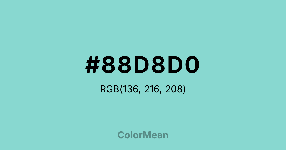 #88D8D0 RGB value is (136, 216, 208). The hex color red value is 136, green is 216, and blue is 208. Its HSL format shows a hue of 174°, saturation of 51 percent, and lightness of 69 percent. The CMYK process values are 37 percent, 0 percent, 4 percent, 15 percent.