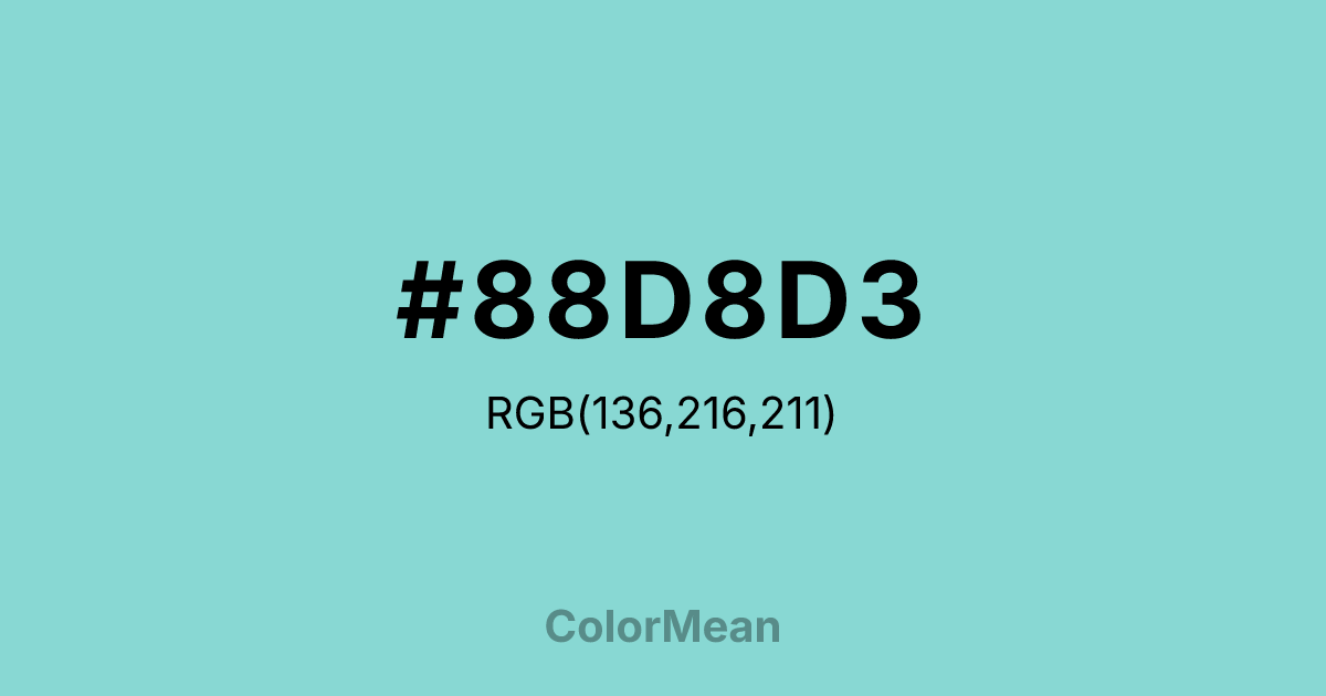 #88D8D3 RGB value is (136, 216, 211). The hex color red value is 136, green is 216, and blue is 211. Its HSL format shows a hue of 176°, saturation of 51 percent, and lightness of 69 percent. The CMYK process values are 37 percent, 0 percent, 2 percent, 15 percent.