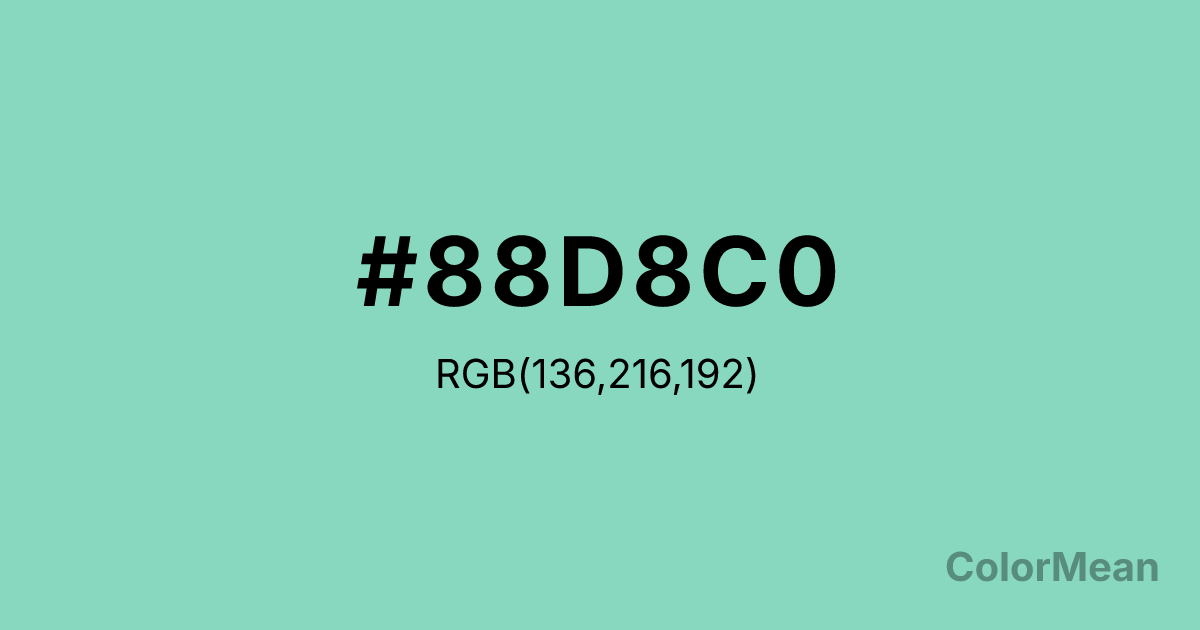 Pearl Aqua (#88D8C0) RGB value is (136, 216, 192). The hex color red value is 136, green is 216, and blue is 192. Its HSL format shows a hue of 162°, saturation of 51 percent, and lightness of 69 percent. The CMYK process values are 37 percent, 0 percent, 11 percent, 15 percent.