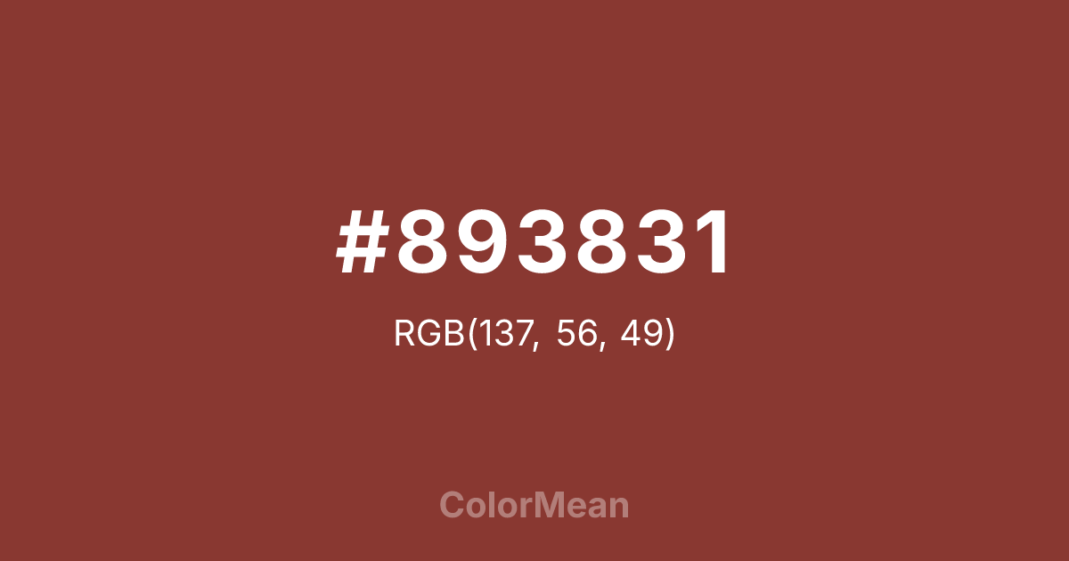 #893831 RGB value is (137, 56, 49). The hex color red value is 137, green is 56, and blue is 49. Its HSL format shows a hue of 5°, saturation of 47 percent, and lightness of 36 percent. The CMYK process values are 0 percent, 59 percent, 64 percent, 46 percent.