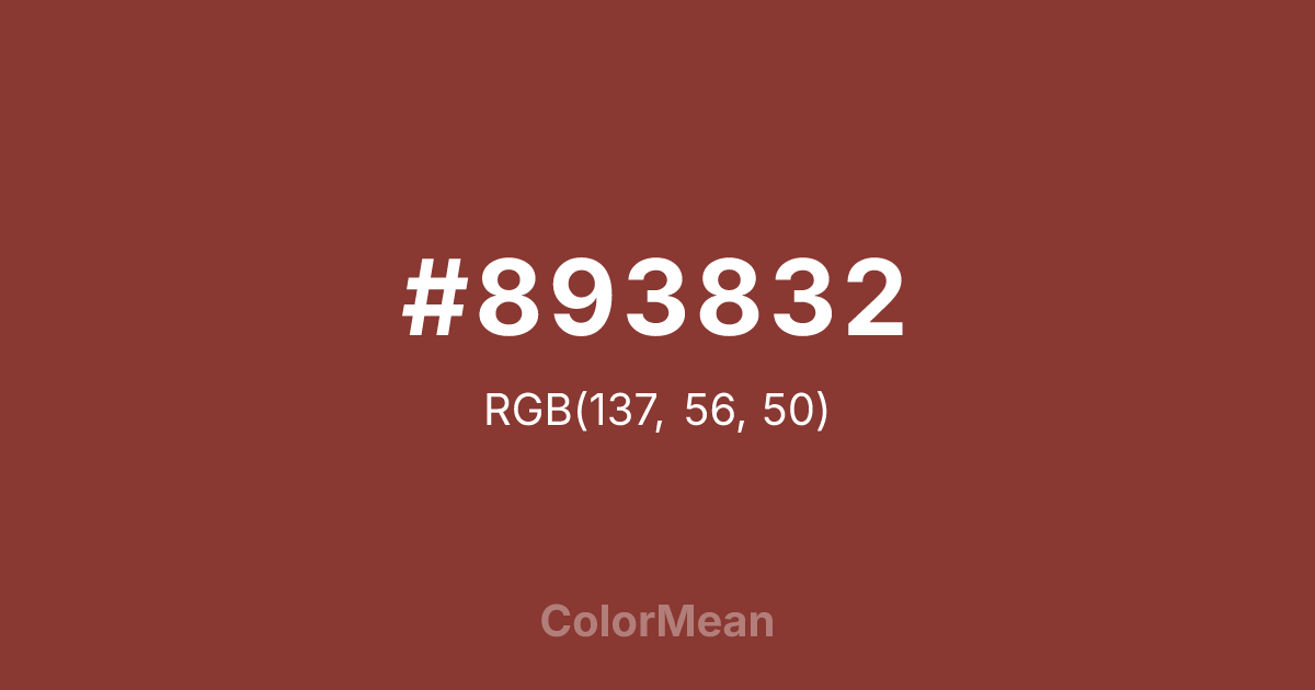 #893832 RGB value is (137, 56, 50). The hex color red value is 137, green is 56, and blue is 50. Its HSL format shows a hue of 4°, saturation of 47 percent, and lightness of 37 percent. The CMYK process values are 0 percent, 59 percent, 64 percent, 46 percent.