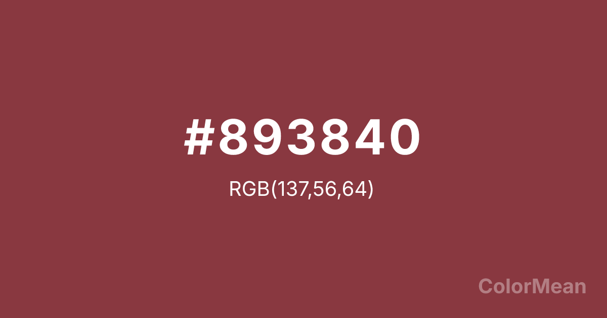 #893840 RGB value is (137, 56, 64). The hex color red value is 137, green is 56, and blue is 64. Its HSL format shows a hue of 354°, saturation of 42 percent, and lightness of 38 percent. The CMYK process values are 0 percent, 59 percent, 53 percent, 46 percent.