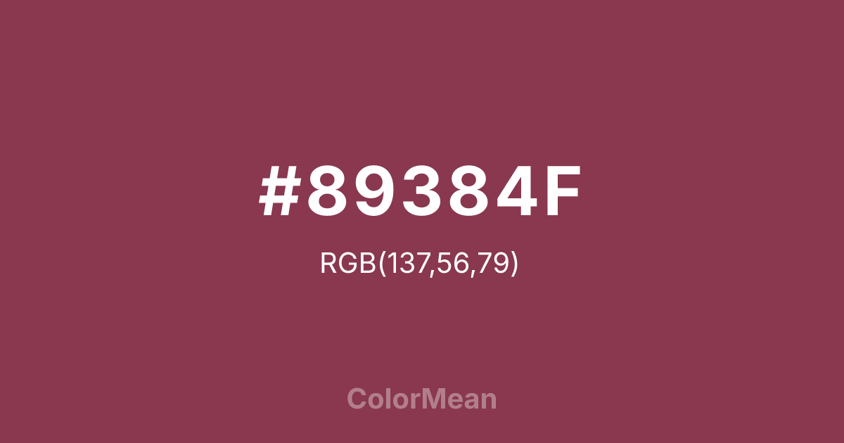 #89384F RGB value is (137, 56, 79). The hex color red value is 137, green is 56, and blue is 79. Its HSL format shows a hue of 343°, saturation of 42 percent, and lightness of 38 percent. The CMYK process values are 0 percent, 59 percent, 42 percent, 46 percent.