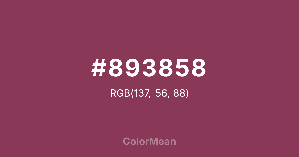 #893858 RGB value is (137, 56, 88). The hex color red value is 137, green is 56, and blue is 88. Its HSL format shows a hue of 336°, saturation of 42 percent, and lightness of 38 percent. The CMYK process values are 0 percent, 59 percent, 36 percent, 46 percent.