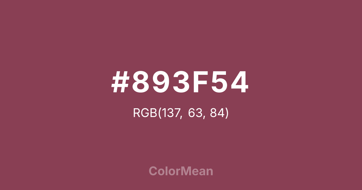 #893F54 RGB value is (137, 63, 84). The hex color red value is 137, green is 63, and blue is 84. Its HSL format shows a hue of 343°, saturation of 37 percent, and lightness of 39 percent. The CMYK process values are 0 percent, 54 percent, 39 percent, 46 percent.