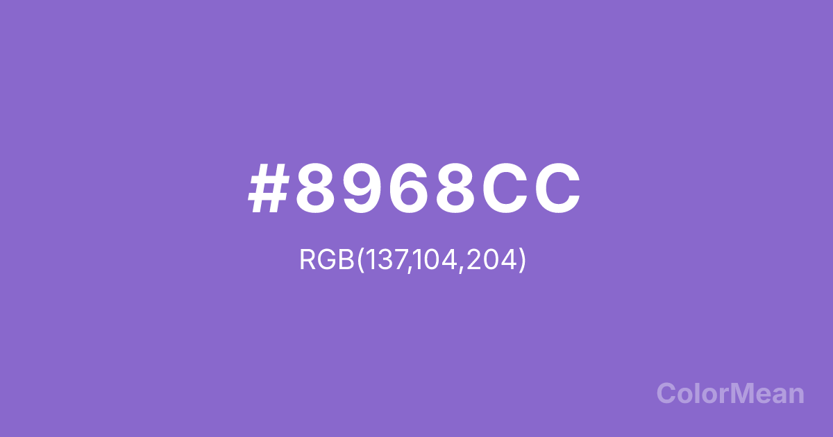 #8968CC RGB value is (137, 104, 204). The hex color red value is 137, green is 104, and blue is 204. Its HSL format shows a hue of 260°, saturation of 50 percent, and lightness of 60 percent. The CMYK process values are 33 percent, 49 percent, 0 percent, 20 percent.