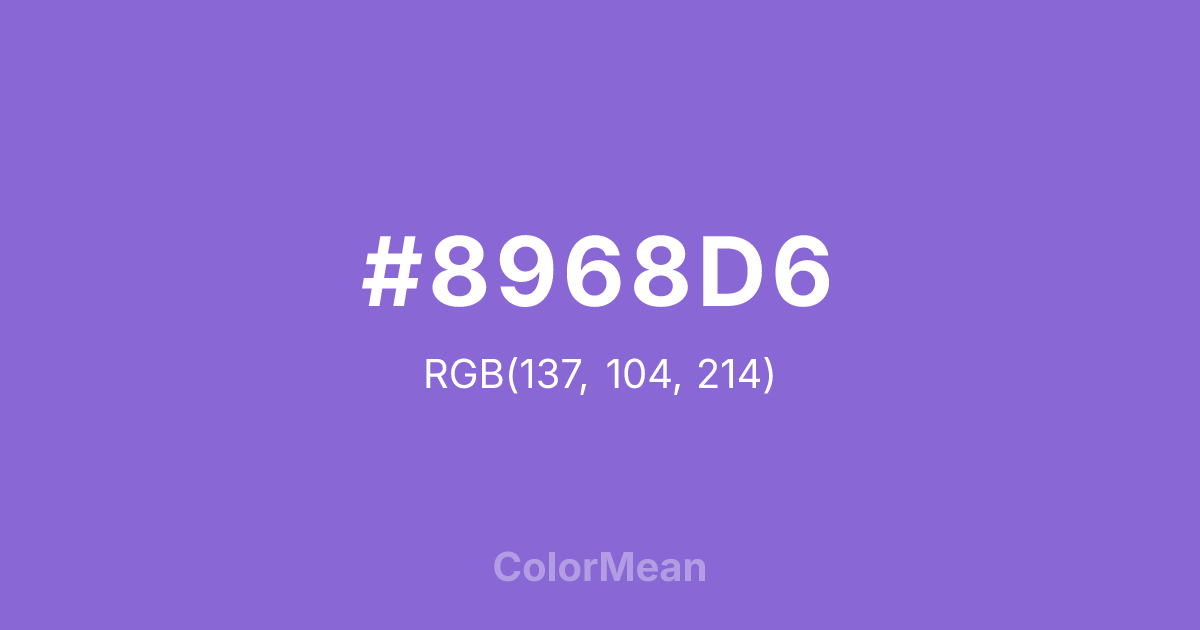 #8968D6 RGB value is (137, 104, 214). The hex color red value is 137, green is 104, and blue is 214. Its HSL format shows a hue of 258°, saturation of 57 percent, and lightness of 62 percent. The CMYK process values are 36 percent, 51 percent, 0 percent, 16 percent.