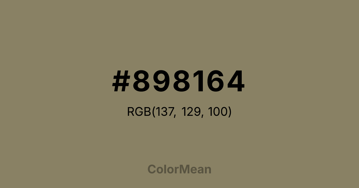 #898164 RGB value is (137, 129, 100). The hex color red value is 137, green is 129, and blue is 100. Its HSL format shows a hue of 47°, saturation of 16 percent, and lightness of 46 percent. The CMYK process values are 0 percent, 6 percent, 27 percent, 46 percent.