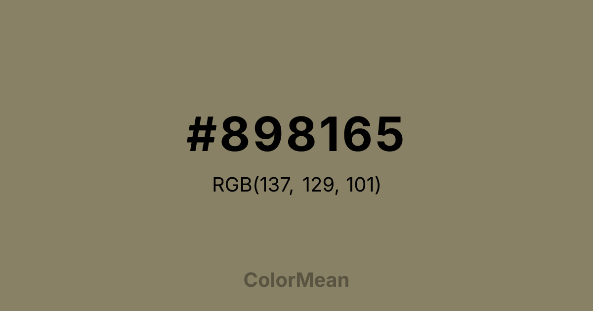 #898165 RGB value is (137, 129, 101). The hex color red value is 137, green is 129, and blue is 101. Its HSL format shows a hue of 47°, saturation of 15 percent, and lightness of 47 percent. The CMYK process values are 0 percent, 6 percent, 26 percent, 46 percent.
