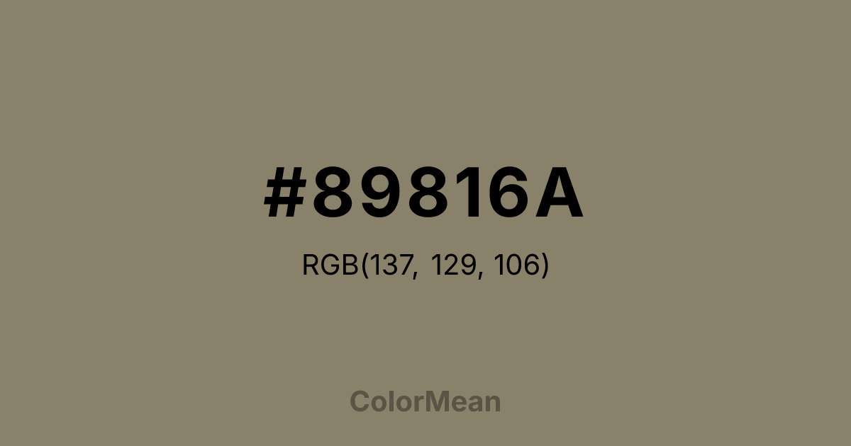 #89816A RGB value is (137, 129, 106). The hex color red value is 137, green is 129, and blue is 106. Its HSL format shows a hue of 45°, saturation of 13 percent, and lightness of 48 percent. The CMYK process values are 0 percent, 6 percent, 23 percent, 46 percent.