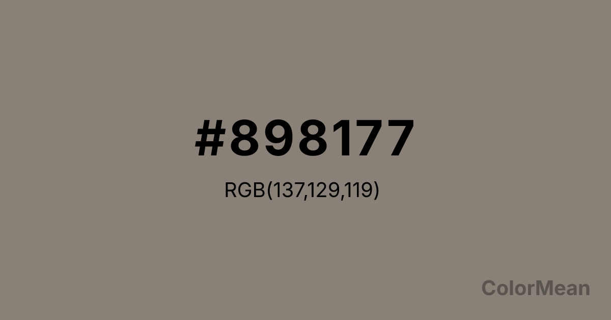 #898177 RGB value is (137, 129, 119). The hex color red value is 137, green is 129, and blue is 119. Its HSL format shows a hue of 33°, saturation of 7 percent, and lightness of 50 percent. The CMYK process values are 0 percent, 6 percent, 13 percent, 46 percent.
