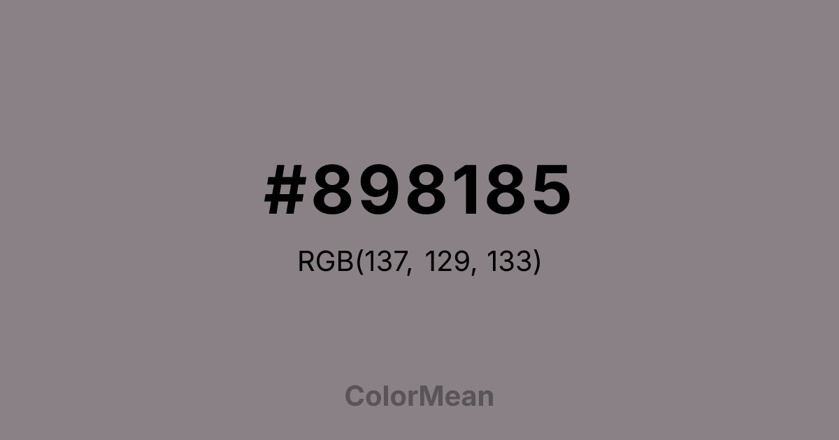 #898185 RGB value is (137, 129, 133). The hex color red value is 137, green is 129, and blue is 133. Its HSL format shows a hue of 330°, saturation of 3 percent, and lightness of 52 percent. The CMYK process values are 0 percent, 6 percent, 3 percent, 46 percent.