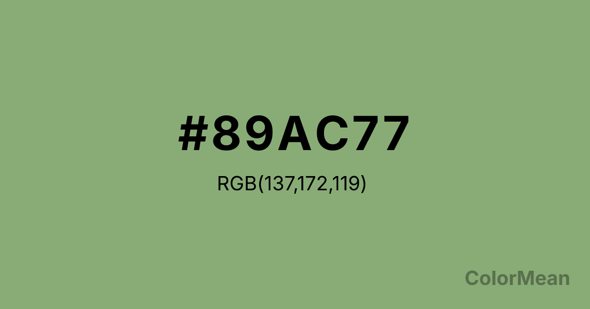 #89AC77 RGB value is (137, 172, 119). The hex color red value is 137, green is 172, and blue is 119. Its HSL format shows a hue of 100°, saturation of 24 percent, and lightness of 57 percent. The CMYK process values are 20 percent, 0 percent, 31 percent, 33 percent.