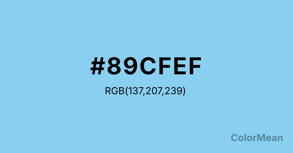#89CFEF RGB value is (137, 207, 239). The hex color red value is 137, green is 207, and blue is 239. Its HSL format shows a hue of 199°, saturation of 76 percent, and lightness of 74 percent. The CMYK process values are 43 percent, 13 percent, 0 percent, 6 percent.