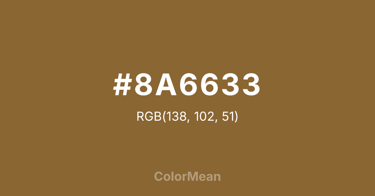#8A6633 RGB value is (138, 102, 51). The hex color red value is 138, green is 102, and blue is 51. Its HSL format shows a hue of 35°, saturation of 46 percent, and lightness of 37 percent. The CMYK process values are 0 percent, 26 percent, 63 percent, 46 percent.