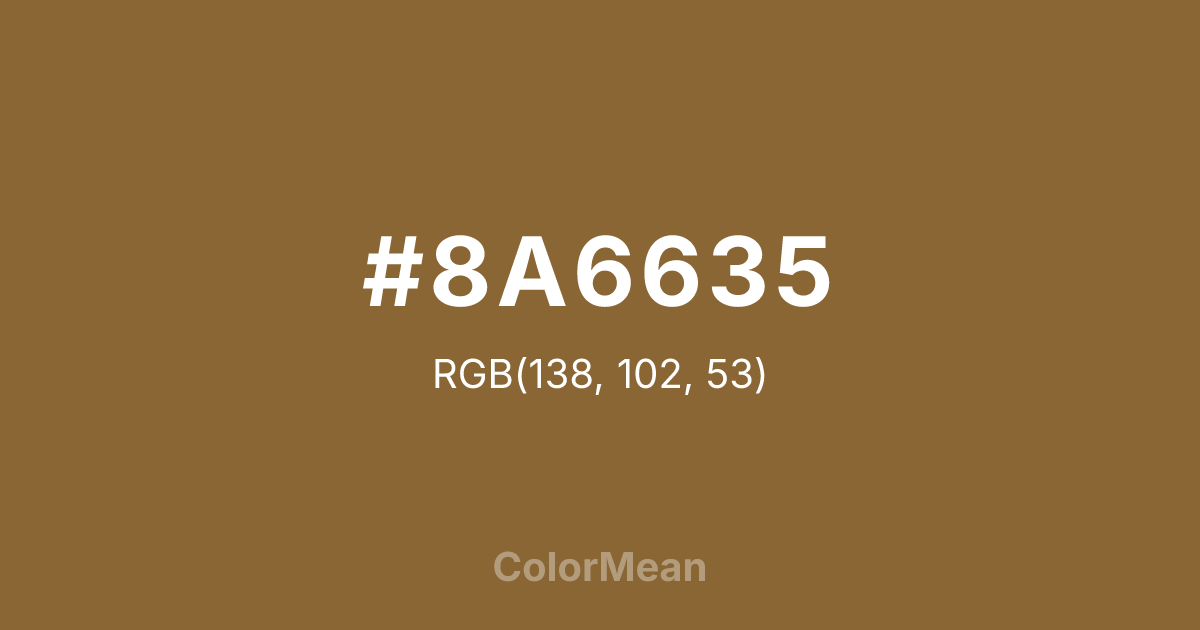 #8A6635 RGB value is (138, 102, 53). The hex color red value is 138, green is 102, and blue is 53. Its HSL format shows a hue of 35°, saturation of 45 percent, and lightness of 37 percent. The CMYK process values are 0 percent, 26 percent, 62 percent, 46 percent.