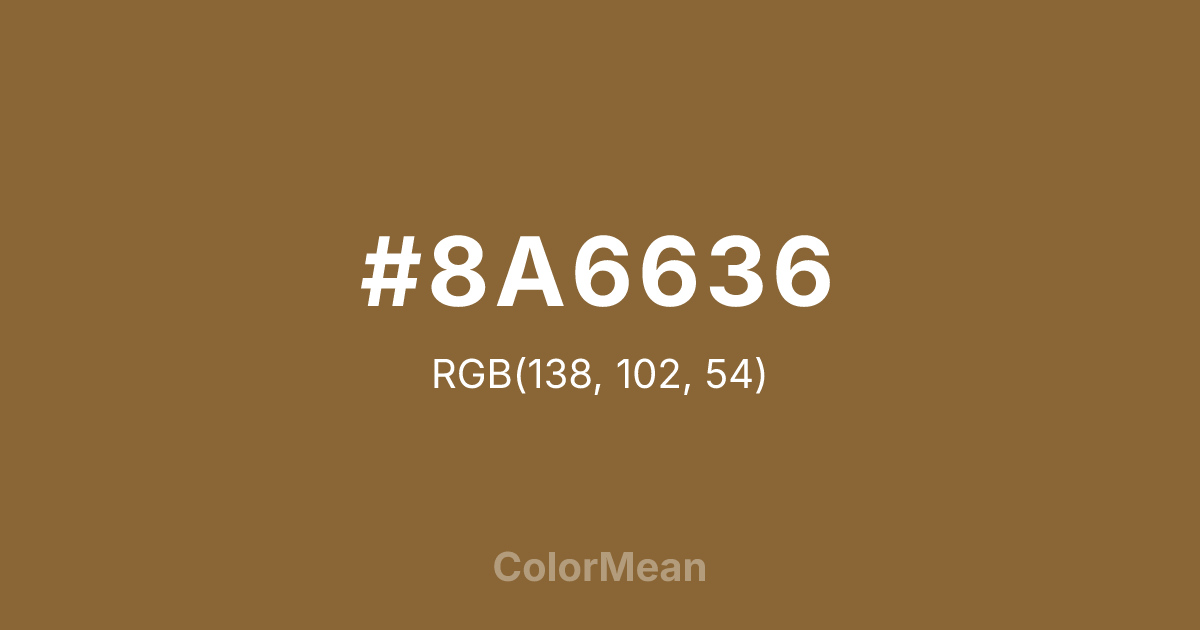 #8A6636 RGB value is (138, 102, 54). The hex color red value is 138, green is 102, and blue is 54. Its HSL format shows a hue of 34°, saturation of 44 percent, and lightness of 38 percent. The CMYK process values are 0 percent, 26 percent, 61 percent, 46 percent.