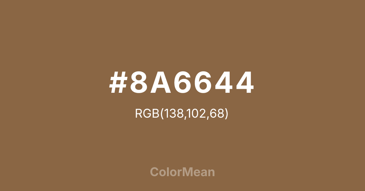 #8A6644 RGB value is (138, 102, 68). The hex color red value is 138, green is 102, and blue is 68. Its HSL format shows a hue of 29°, saturation of 34 percent, and lightness of 40 percent. The CMYK process values are 0 percent, 26 percent, 51 percent, 46 percent.