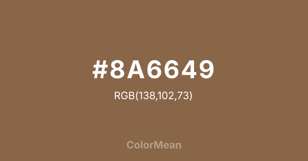 #8A6649 RGB value is (138, 102, 73). The hex color red value is 138, green is 102, and blue is 73. Its HSL format shows a hue of 27°, saturation of 31 percent, and lightness of 41 percent. The CMYK process values are 0 percent, 26 percent, 47 percent, 46 percent.