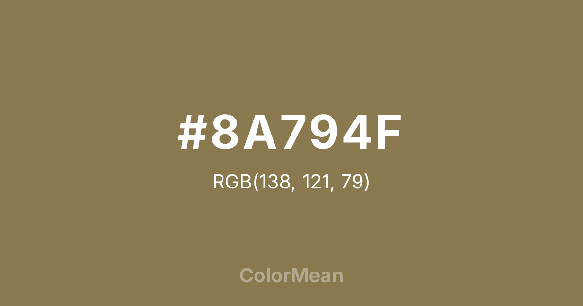 #8A794F RGB value is (138, 121, 79). The hex color red value is 138, green is 121, and blue is 79. Its HSL format shows a hue of 43°, saturation of 27 percent, and lightness of 43 percent. The CMYK process values are 0 percent, 12 percent, 43 percent, 46 percent.