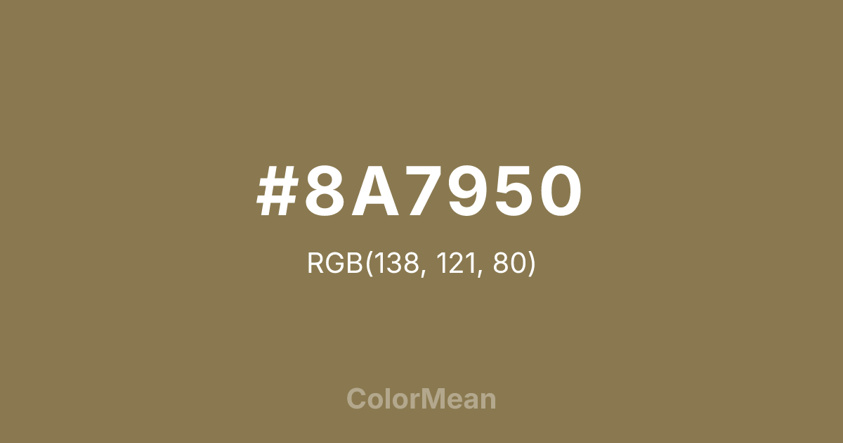#8A7950 RGB value is (138, 121, 80). The hex color red value is 138, green is 121, and blue is 80. Its HSL format shows a hue of 42°, saturation of 27 percent, and lightness of 43 percent. The CMYK process values are 0 percent, 12 percent, 42 percent, 46 percent.