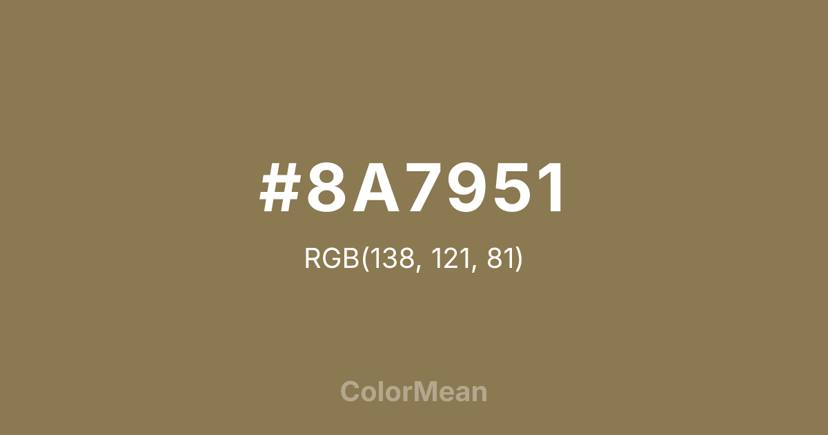 #8A7951 RGB value is (138, 121, 81). The hex color red value is 138, green is 121, and blue is 81. Its HSL format shows a hue of 42°, saturation of 26 percent, and lightness of 43 percent. The CMYK process values are 0 percent, 12 percent, 41 percent, 46 percent.
