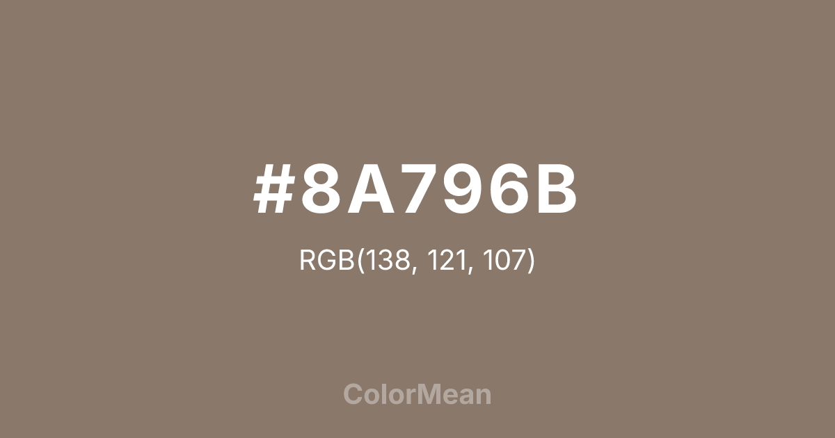 #8A796B RGB value is (138, 121, 107). The hex color red value is 138, green is 121, and blue is 107. Its HSL format shows a hue of 27°, saturation of 13 percent, and lightness of 48 percent. The CMYK process values are 0 percent, 12 percent, 22 percent, 46 percent.