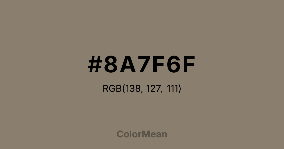 #8A7F6F RGB value is (138, 127, 111). The hex color red value is 138, green is 127, and blue is 111. Its HSL format shows a hue of 36°, saturation of 11 percent, and lightness of 49 percent. The CMYK process values are 0 percent, 8 percent, 20 percent, 46 percent.