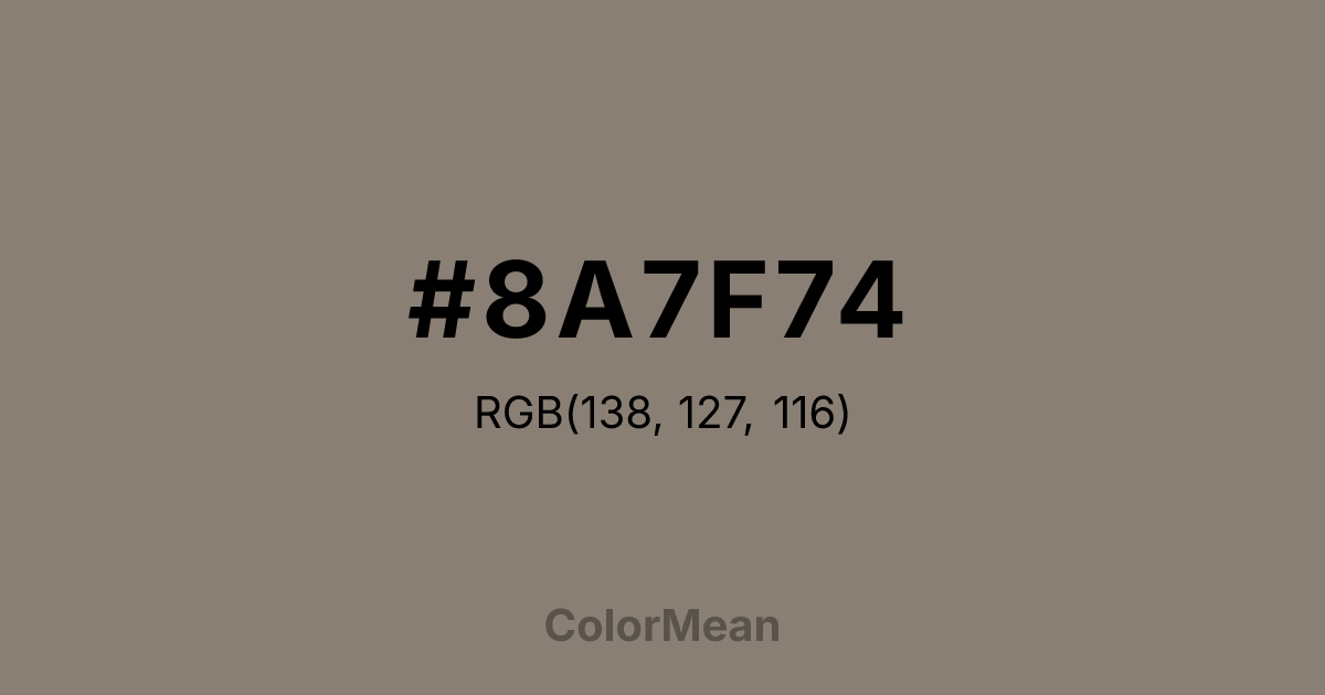 #8A7F74 RGB value is (138, 127, 116). The hex color red value is 138, green is 127, and blue is 116. Its HSL format shows a hue of 30°, saturation of 9 percent, and lightness of 50 percent. The CMYK process values are 0 percent, 8 percent, 16 percent, 46 percent.