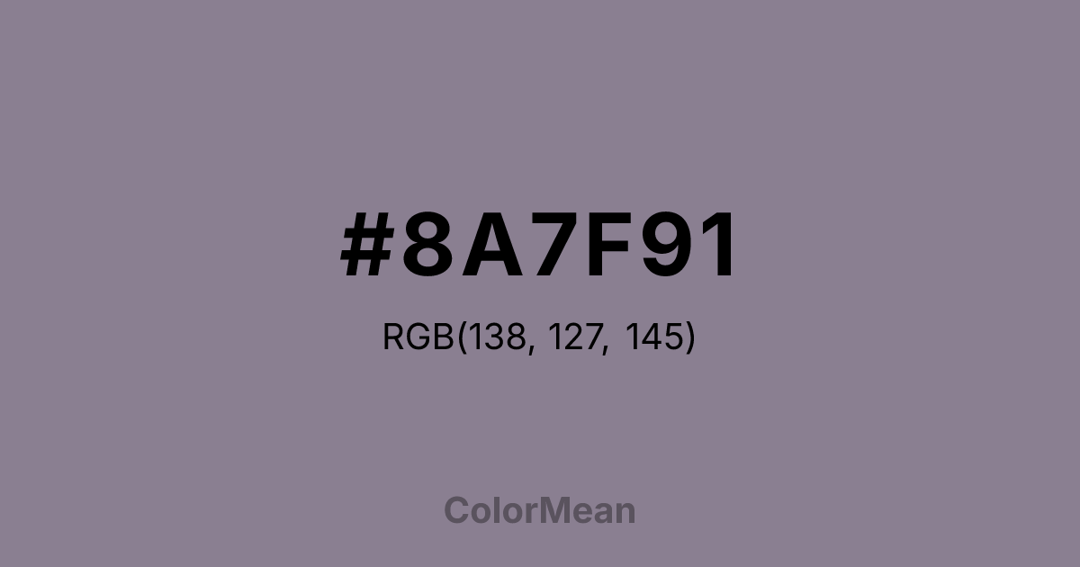 #8A7F91 RGB value is (138, 127, 145). The hex color red value is 138, green is 127, and blue is 145. Its HSL format shows a hue of 277°, saturation of 8 percent, and lightness of 53 percent. The CMYK process values are 5 percent, 12 percent, 0 percent, 43 percent.