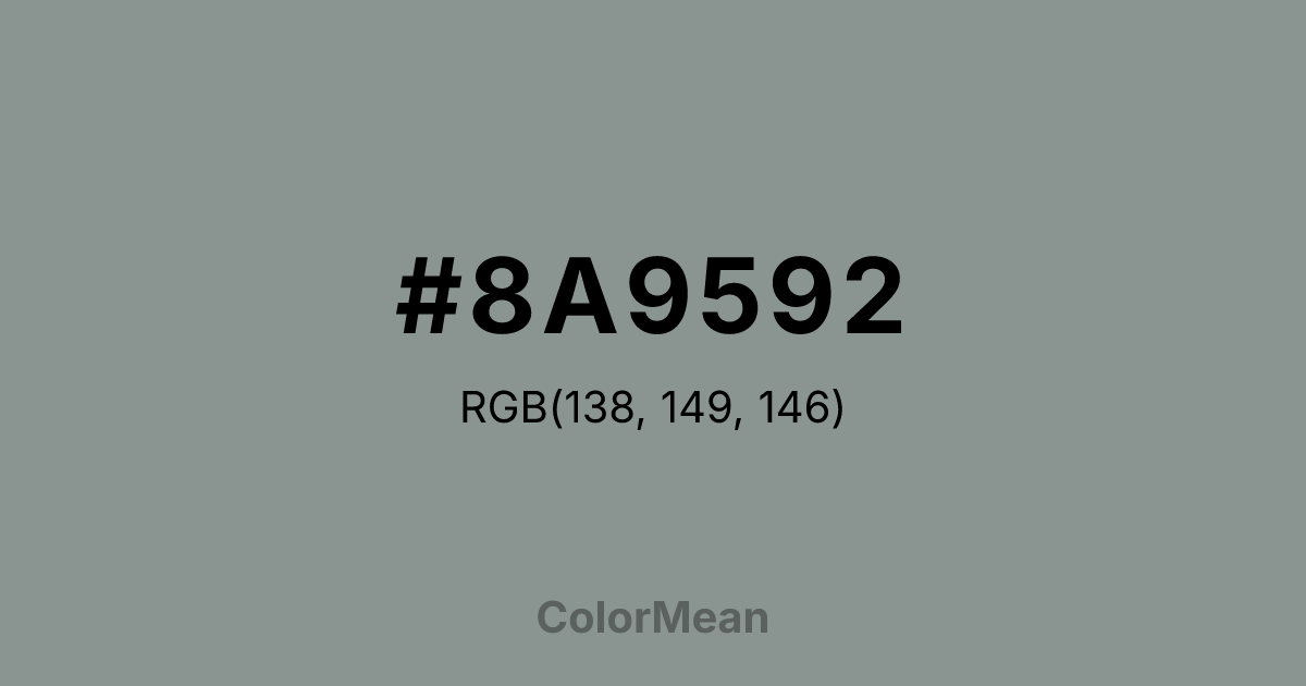 #8A9592 RGB value is (138, 149, 146). The hex color red value is 138, green is 149, and blue is 146. Its HSL format shows a hue of 164°, saturation of 5 percent, and lightness of 56 percent. The CMYK process values are 7 percent, 0 percent, 2 percent, 42 percent.