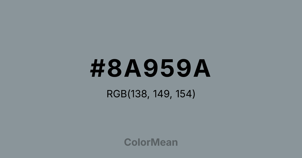 #8A959A RGB value is (138, 149, 154). The hex color red value is 138, green is 149, and blue is 154. Its HSL format shows a hue of 199°, saturation of 7 percent, and lightness of 57 percent. The CMYK process values are 10 percent, 3 percent, 0 percent, 40 percent.