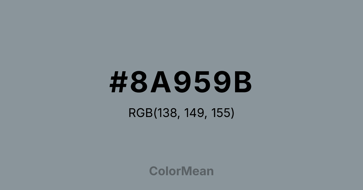 #8A959B RGB value is (138, 149, 155). The hex color red value is 138, green is 149, and blue is 155. Its HSL format shows a hue of 201°, saturation of 8 percent, and lightness of 57 percent. The CMYK process values are 11 percent, 4 percent, 0 percent, 39 percent.