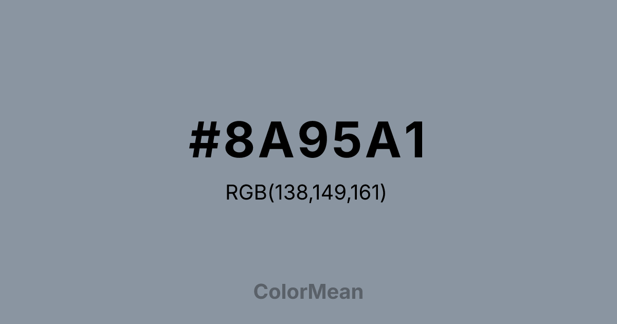 #8A95A1 RGB value is (138, 149, 161). The hex color red value is 138, green is 149, and blue is 161. Its HSL format shows a hue of 211°, saturation of 11 percent, and lightness of 59 percent. The CMYK process values are 14 percent, 7 percent, 0 percent, 37 percent.