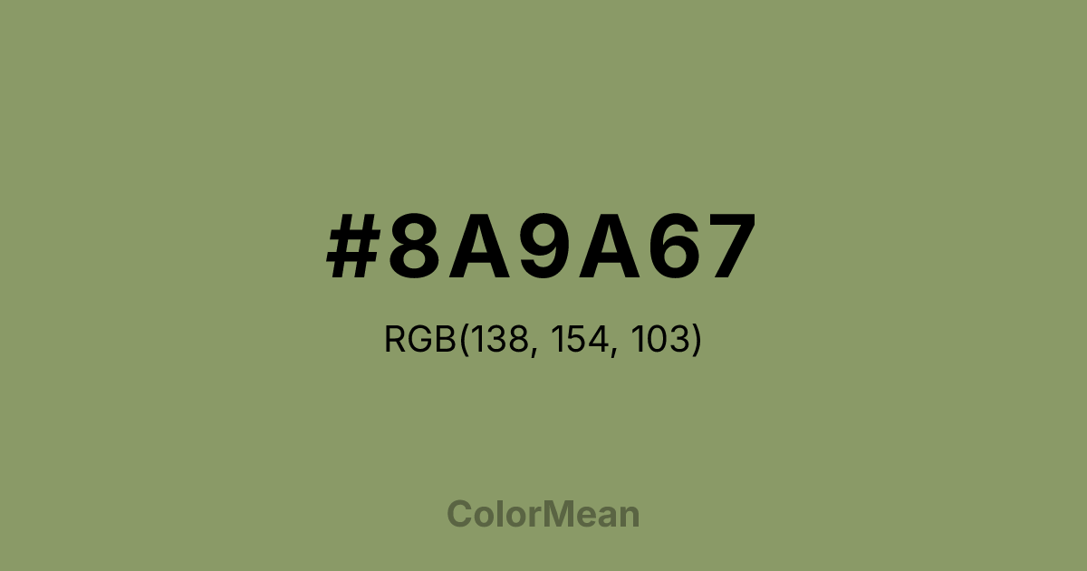 #8A9A67 RGB value is (138, 154, 103). The hex color red value is 138, green is 154, and blue is 103. Its HSL format shows a hue of 79°, saturation of 20 percent, and lightness of 50 percent. The CMYK process values are 10 percent, 0 percent, 33 percent, 40 percent.