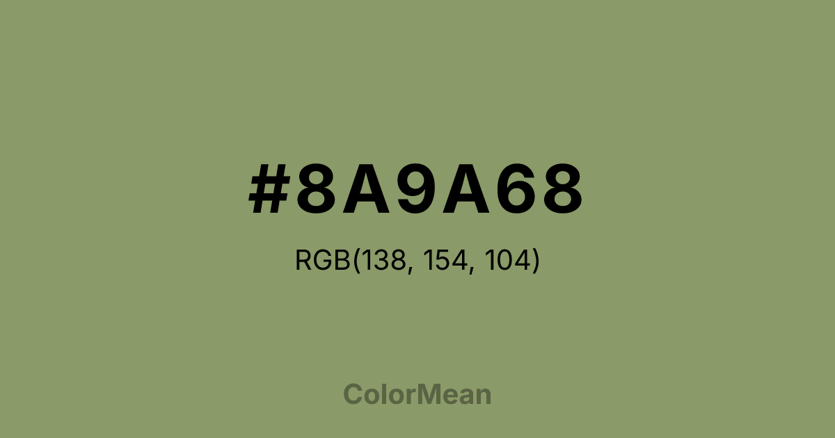 #8A9A68 RGB value is (138, 154, 104). The hex color red value is 138, green is 154, and blue is 104. Its HSL format shows a hue of 79°, saturation of 20 percent, and lightness of 51 percent. The CMYK process values are 10 percent, 0 percent, 32 percent, 40 percent.