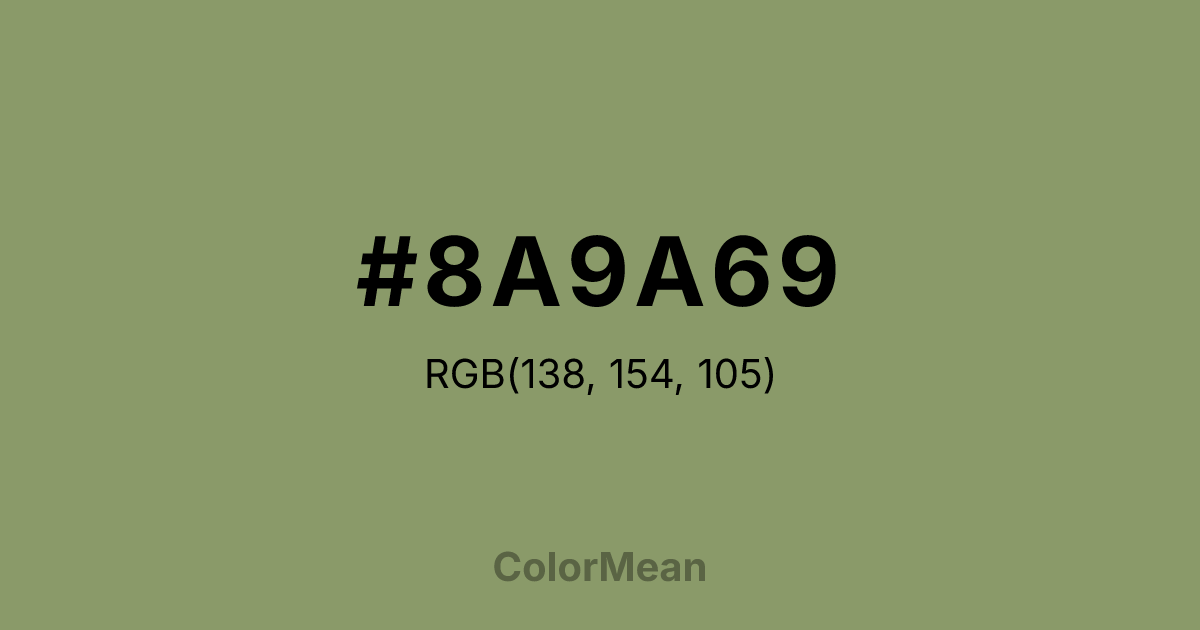 #8A9A69 RGB value is (138, 154, 105). The hex color red value is 138, green is 154, and blue is 105. Its HSL format shows a hue of 80°, saturation of 20 percent, and lightness of 51 percent. The CMYK process values are 10 percent, 0 percent, 32 percent, 40 percent.